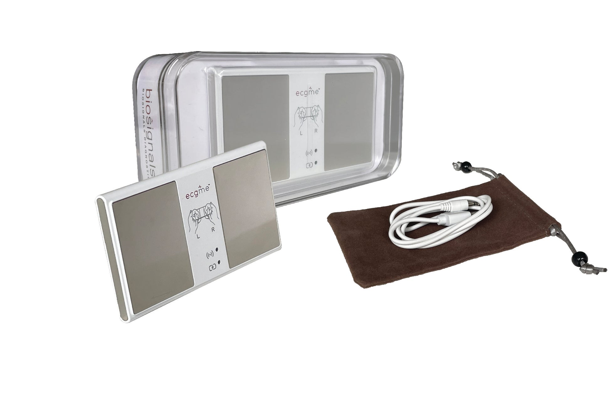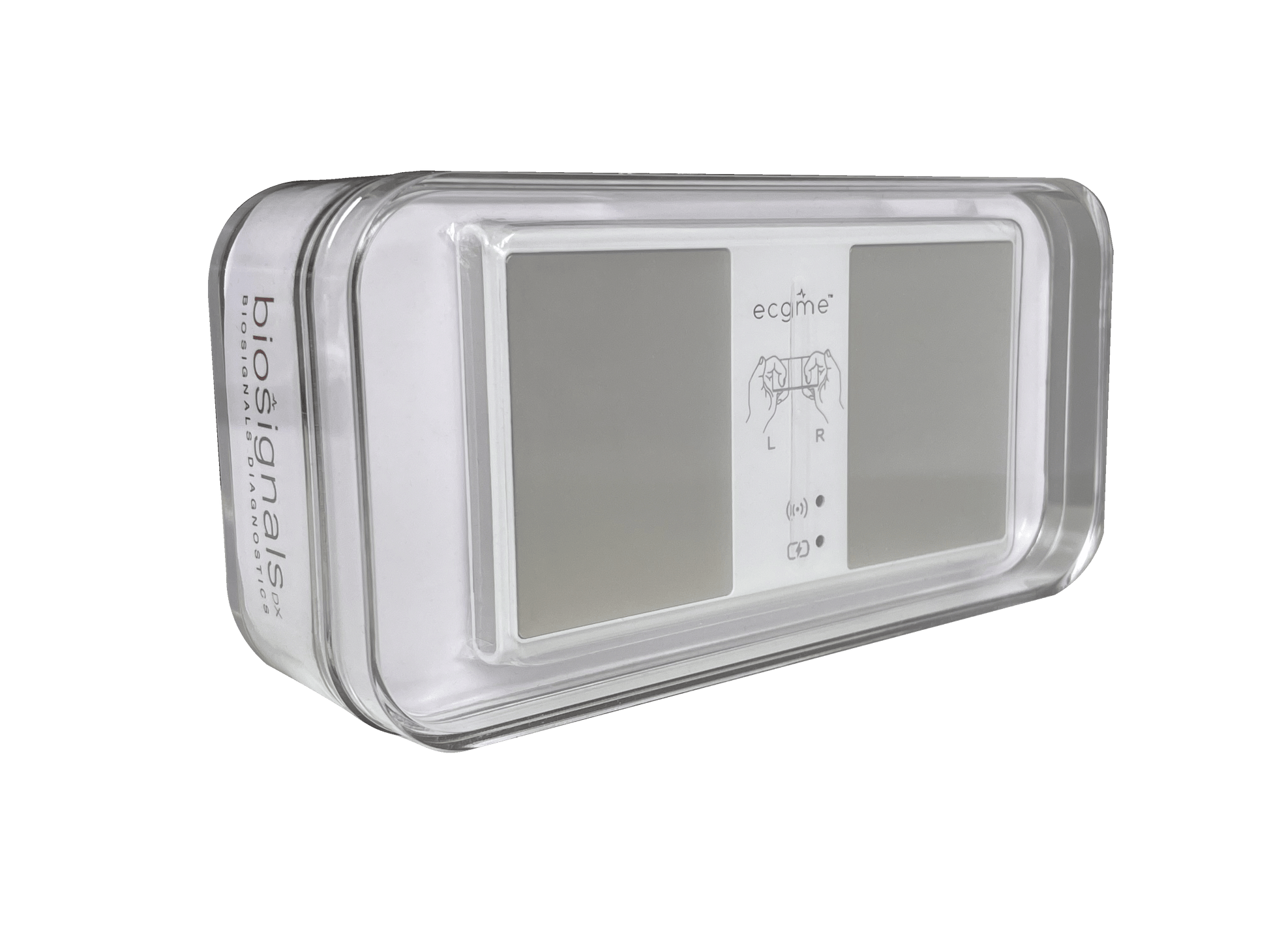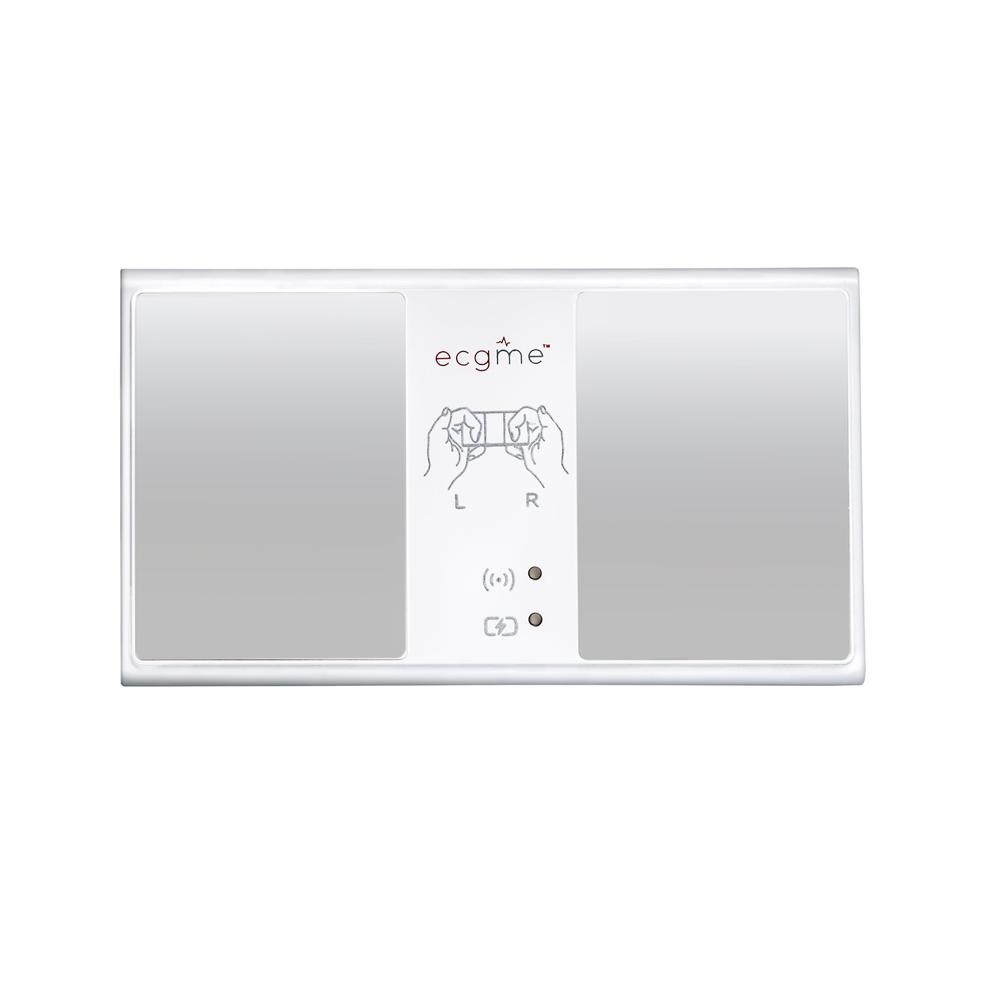 "ecgme" is a small hand-held device, the size of a credit card for measuring your ECG, and connects to our mobile phone app via Bluetooth.